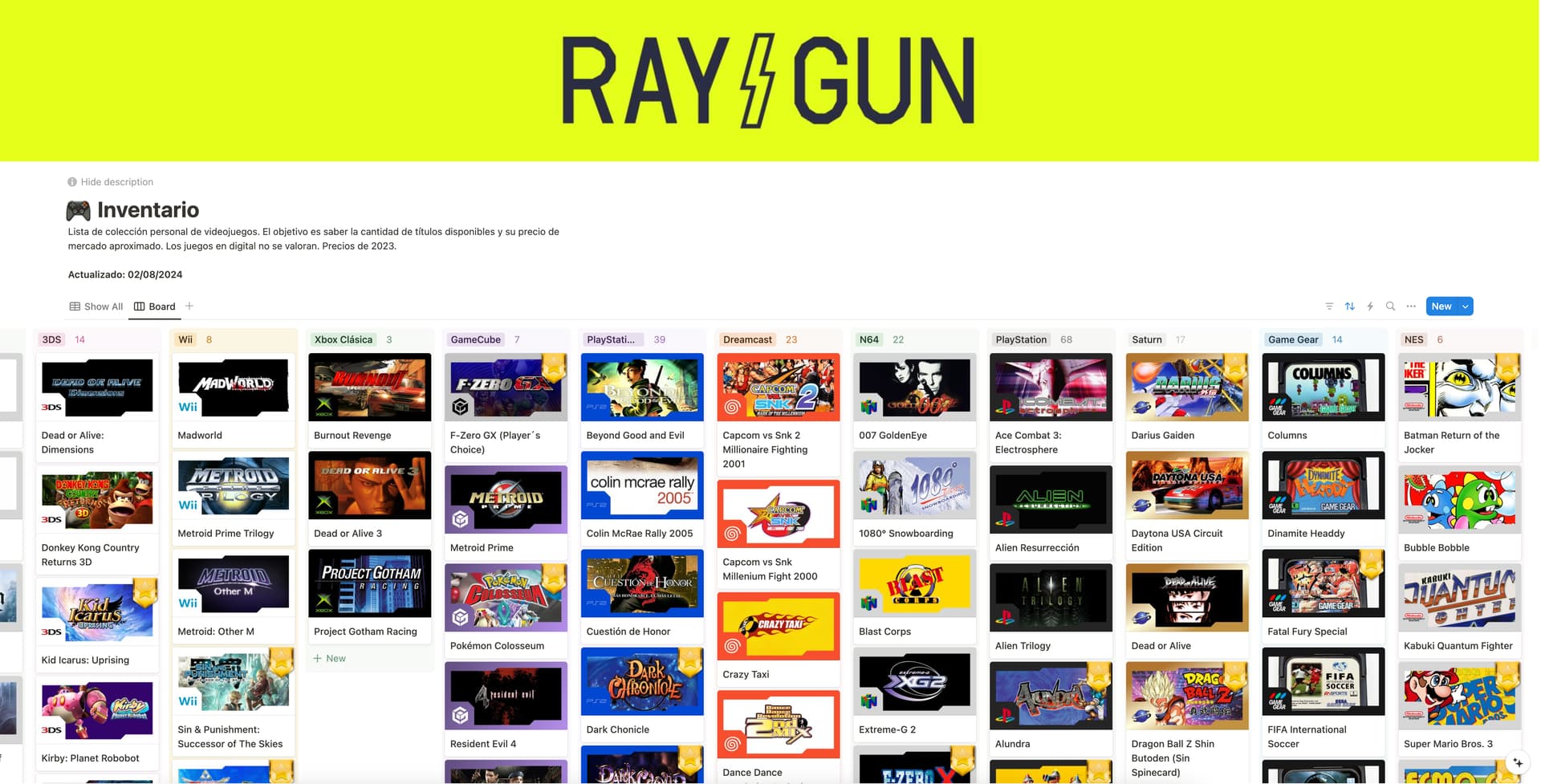 Yo tengo el inventario en Notion que me parece mucho más manejable y visual que un excel. La puedo visualizar de dos maneras, a modo de lista y con los filtros la ordeno como quiera. Por ejemplo, solo juegos físicos, digitales, o solo cartucho, o PAL españa, etc. Y puedo ver de un vistazo el precio de la suma total: