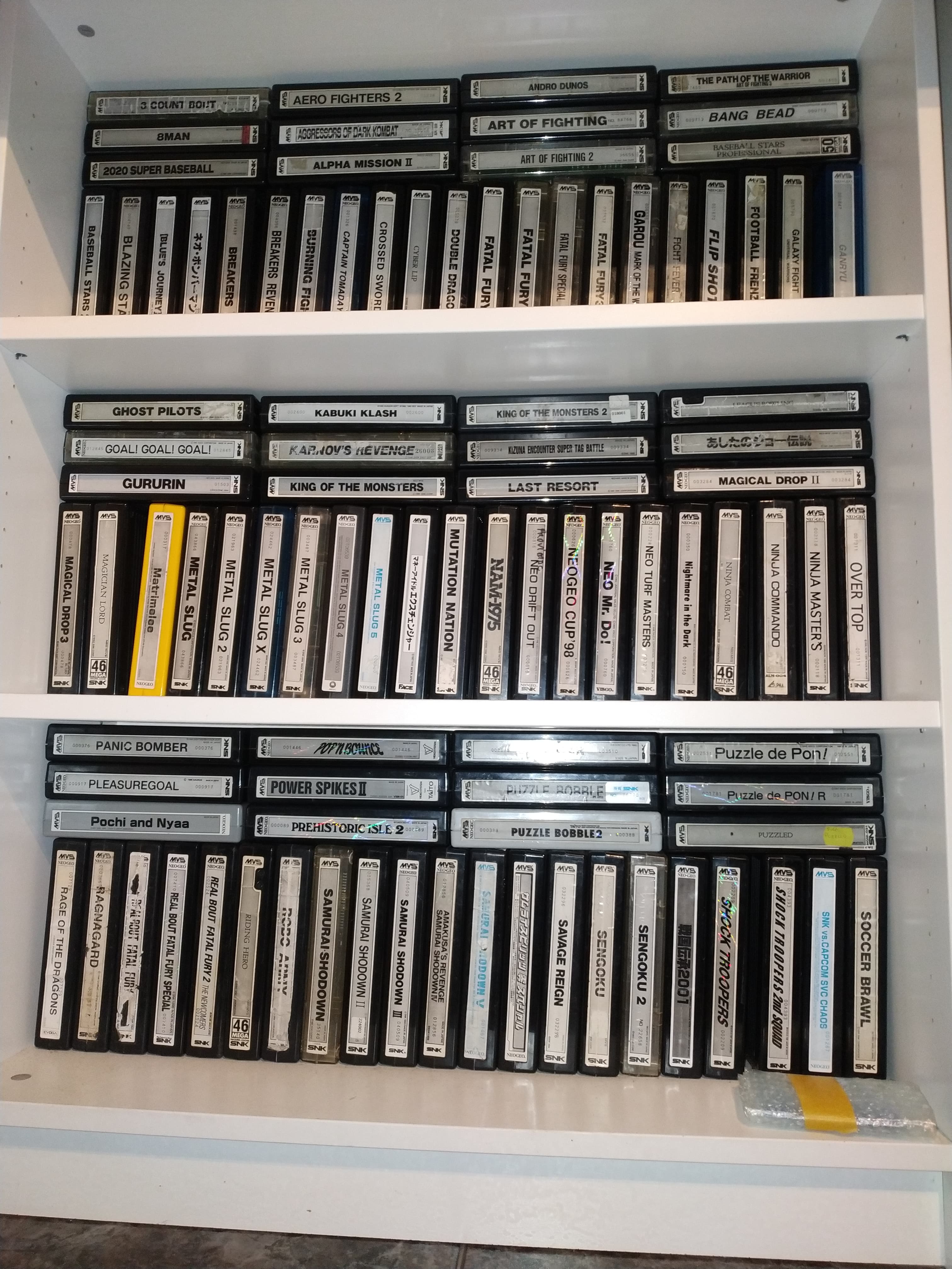 Davichi, la colección la empece en 2015-2016, al principio la hice con juegos que venían de operador, me plante en 60 y algo, y fue cuandl decidi ir a por el fullset, de cuandl empece a ahora ya estoy desfasado en precios, por que si mi primer juego fue un metal slug 2 no volvia a mirar el precio de ese juego, juegos como blazing star valian 80-100 y ahora me dicen pasan de 200€ por eso no se el valor que tiene, tampoco apunte lo que me costo, ojala lo hubiera hecho, te pongo unas fotos de la colección!