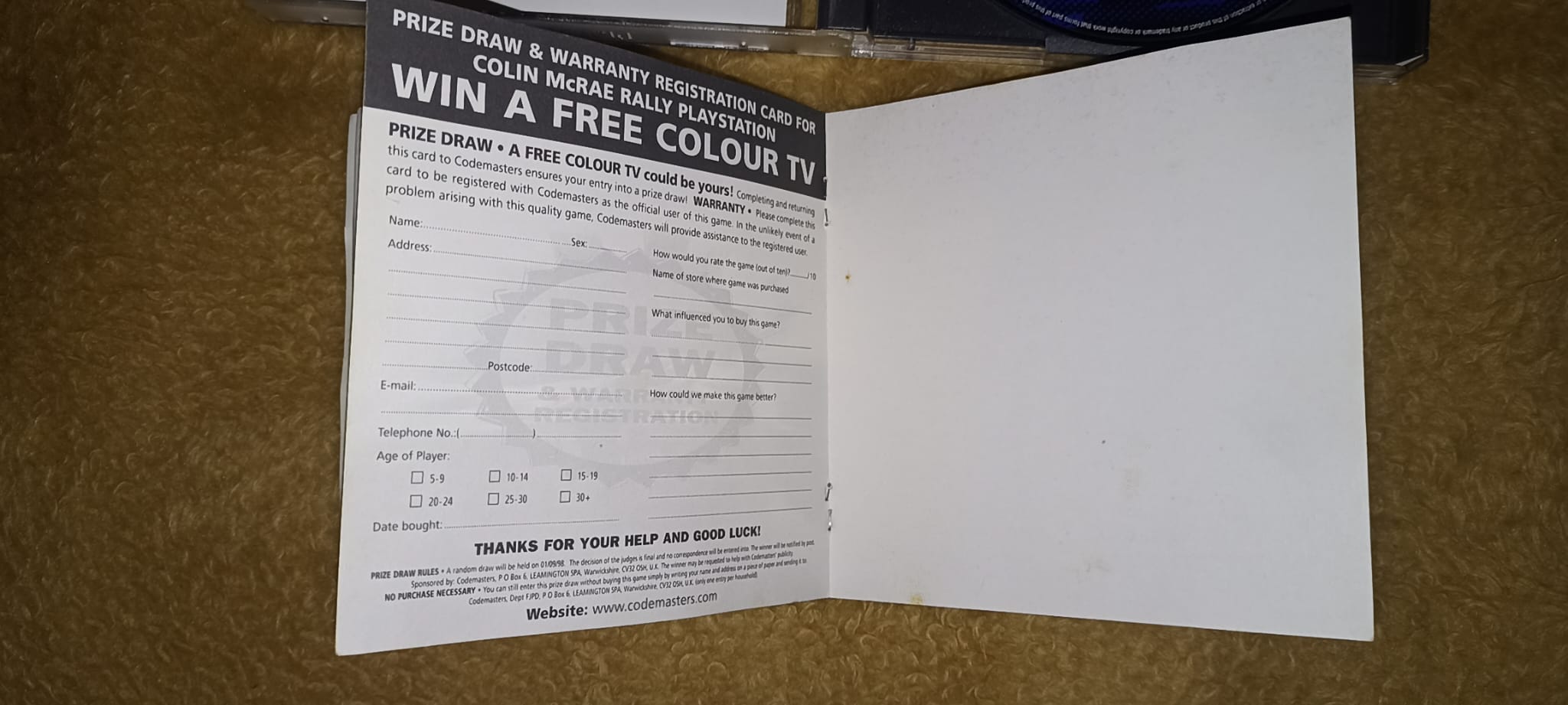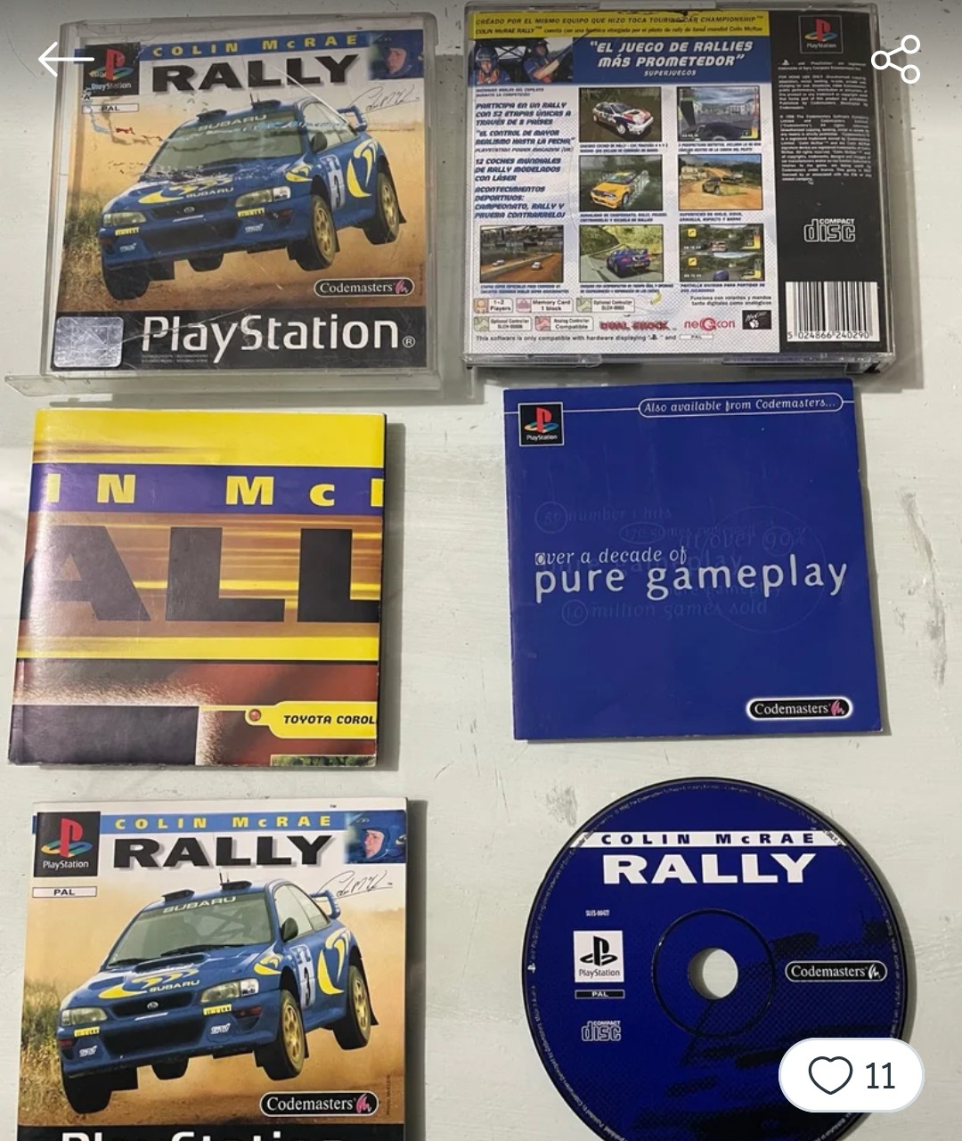 Quería saber si alguien tiene de la época el Colin McRae Rally black label de PS1, pq tengo ciertas dudas del contenido y la pegatina de puntuación si la llevaba en la caja o no. Por lo que se en el interior llevaba el manual, un poster y un panfleto de publicidad pero he visto dos variantes, una con el Codemasters presenta y otra con el pure gameplay. Alguien sabe cuál es la buena?