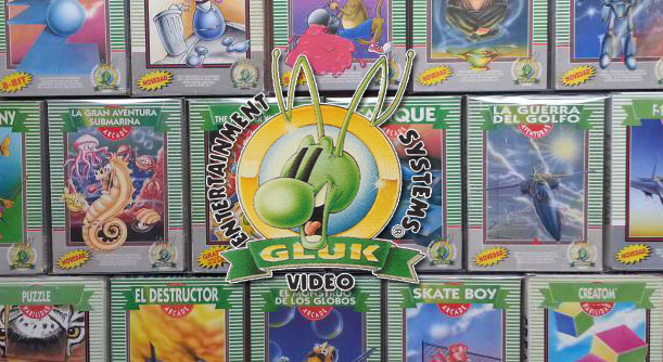 Pero el caso de los juegos era algo diferente y similar en algunas cuestiones al caso de los títulos de “TENGEN”, y es que la compañía publicó juegos sin licencia de “Nintendo”, con su propio diseño de caja (estas eran verdes, blancas y grises. Además incorporaban aparte el nombre del juego, la palabra donde indicaba el género al que pertenecía ese juego: Arcade, Puzzle, etc…, un dibujo muchas veces muy simple y pintado a mano y en la esquina donde “Nintendo” pone su sello de calidad, los “Gluk” también ponían su própio sello donde se veía su mascota representativa, que era algo así como un grillo o marciano verde… nunca lo he tenido claro del todo…).
