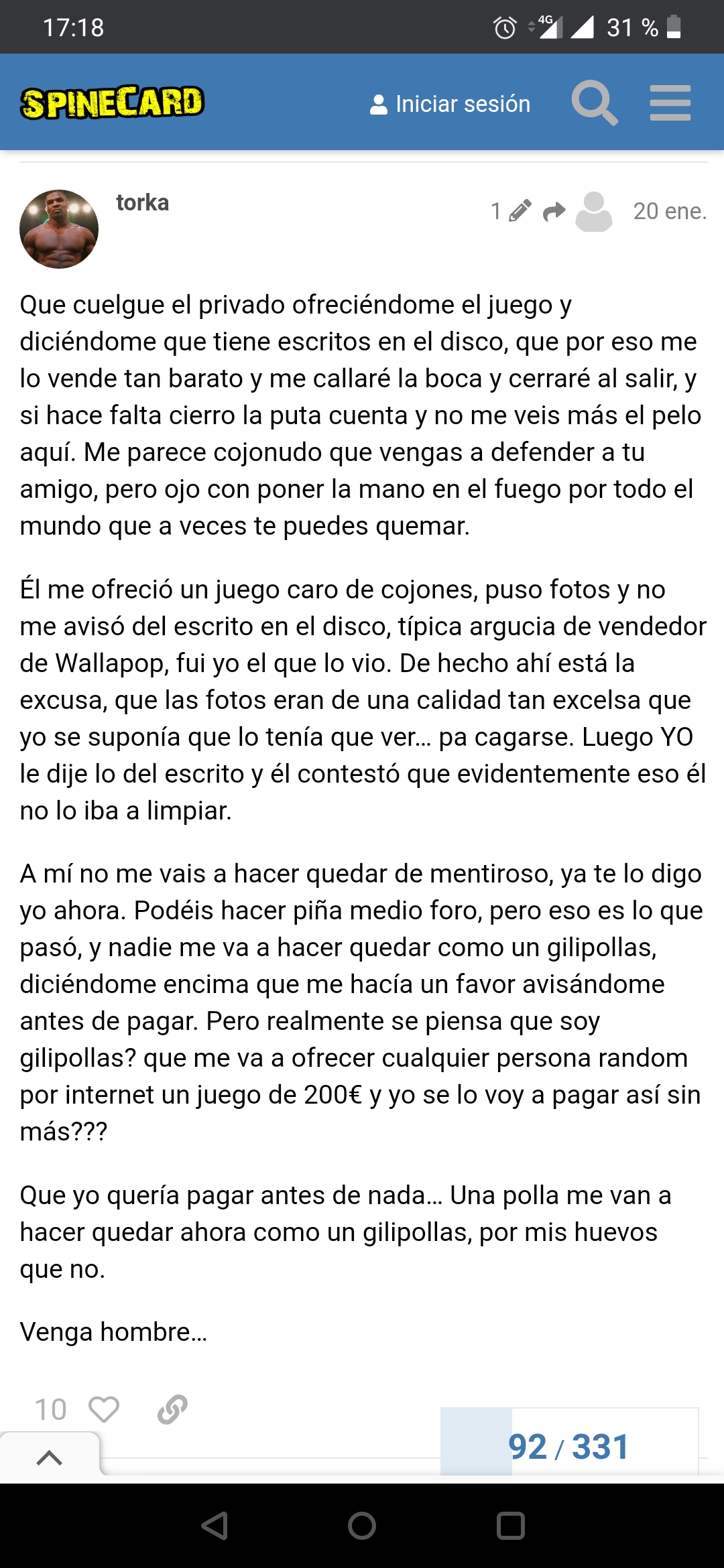 Respecto a lo otro, omitir información de estado, ya sea un garabato oculto en un cd o vender una repro es lo mismo, engañar (o intentarlo), y eres un hipócrita por decir lo anterior, de ahí que me pasaran el mensaje, porque la gente no daba crédito a que tuvieras la cara de soltar eso después de hacer tú exactamente lo mismo, “mira las fotos” es mucho menos legal que cuándo te hablen decir, oye, son repros, como ya ha demostrado otro usuario en el hilo yendo a comprarle el lote.