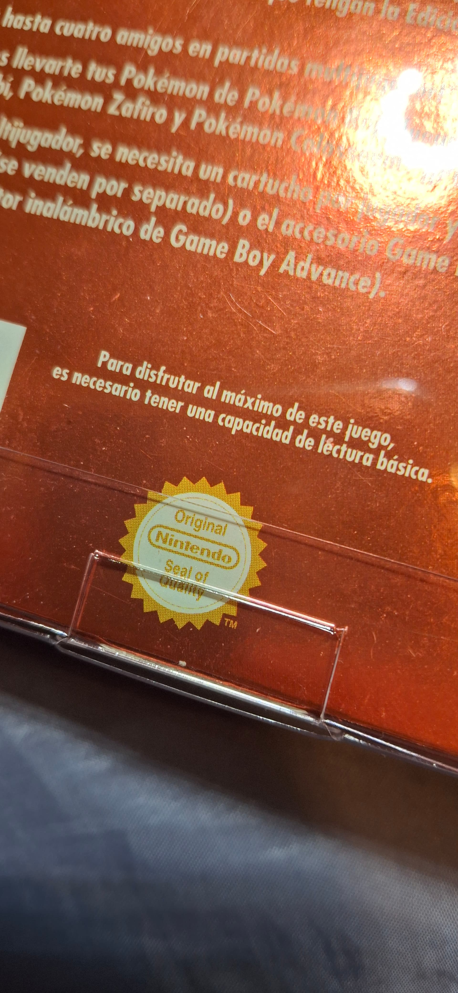 A ver si alguien me puede ayudar, se trata de la caja de un pokemon rojo fuego y tengo dudas de que sea repro, la caja en si esta muy bien hecha e impresa, tiene ese brillo carateristico y los textos/imagenes muy definidas, lo unico, y lo que me hace dudar, es el sello de calidad, nose…lo veo como muy cutre, no tiene ese brillo que se ve cuando lo miras a trasluz y es de color amarillo…me extraña que estando tan bien impresa en general, sea solo el sello el que se vea mal…si alguien que lo tenga y me puede confirmar que el sello es asi, o deberia verse como el resto de juegos de gba…Muchas gracias de antemano.