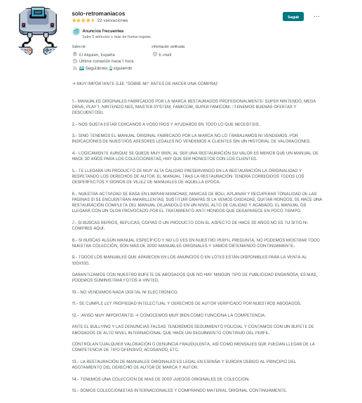 Muy buenas foreros!! El otro día hice una compra de dos manuales, supuestamente originales y restaurados a un vendedor en Vinted. Me pareció “barato” para todo el trabajo que supuestamente hace (10€) cada uno…Nose si alguien ha topado con esta persona, y quería pediros opinión sobre ello.