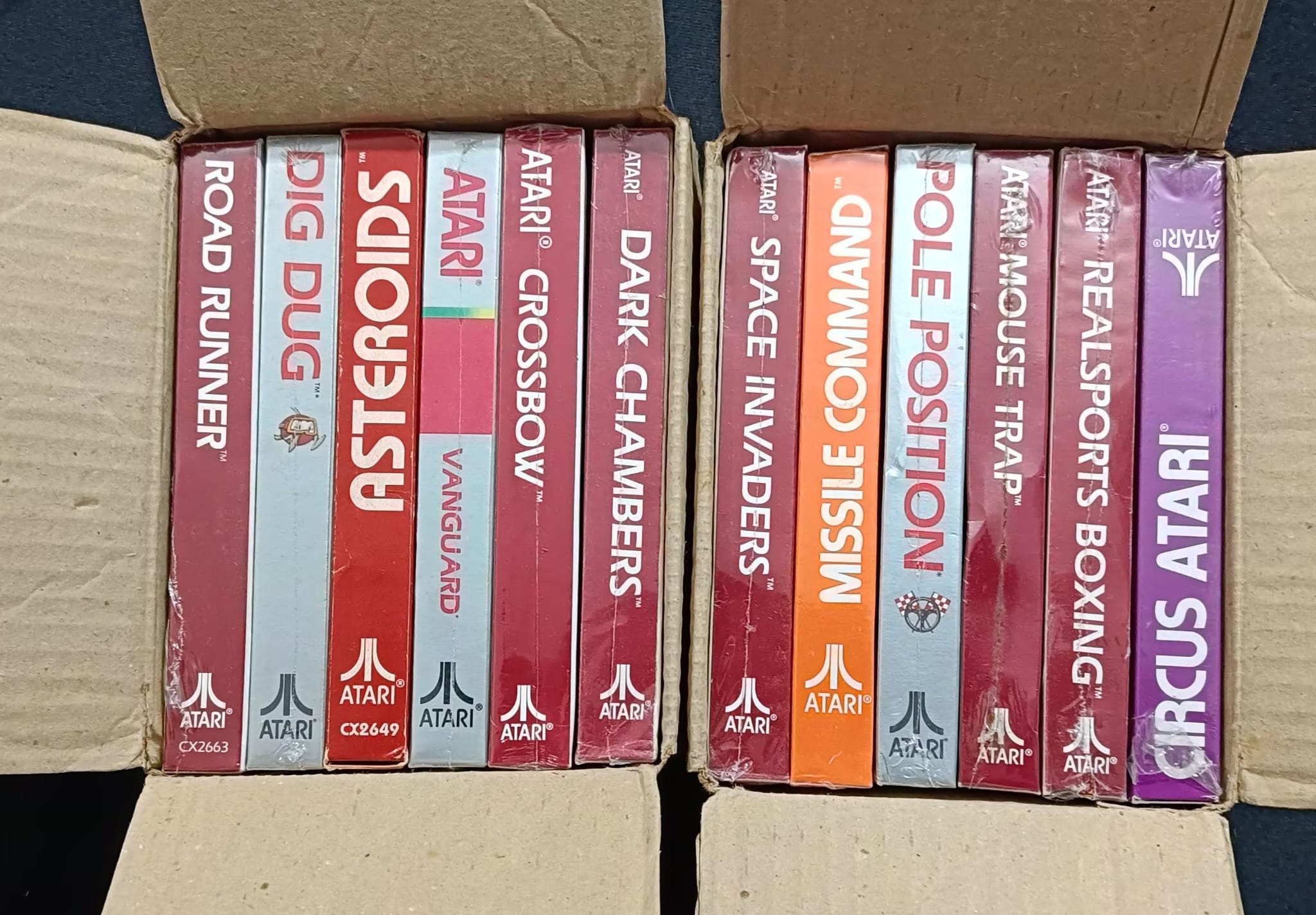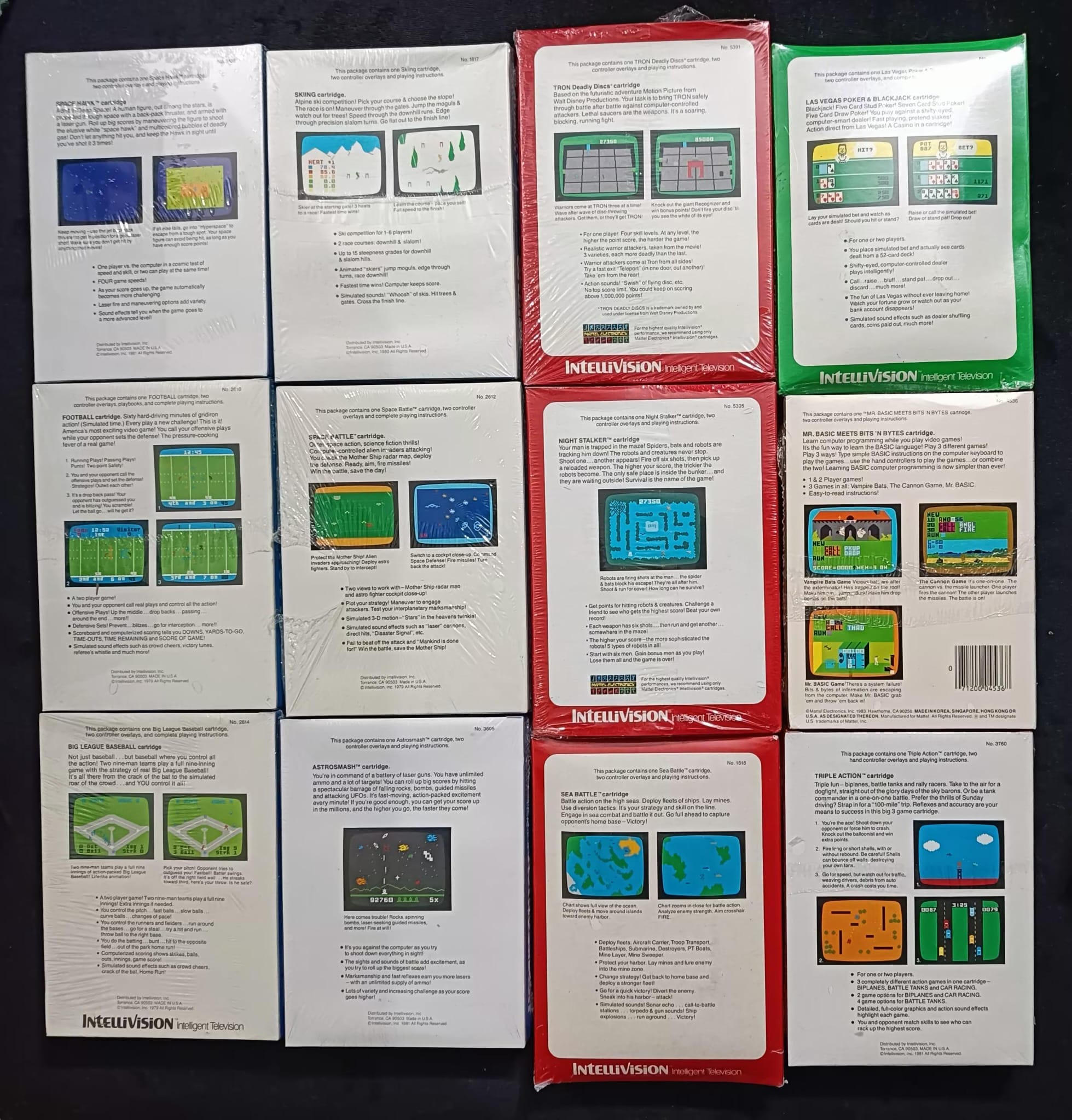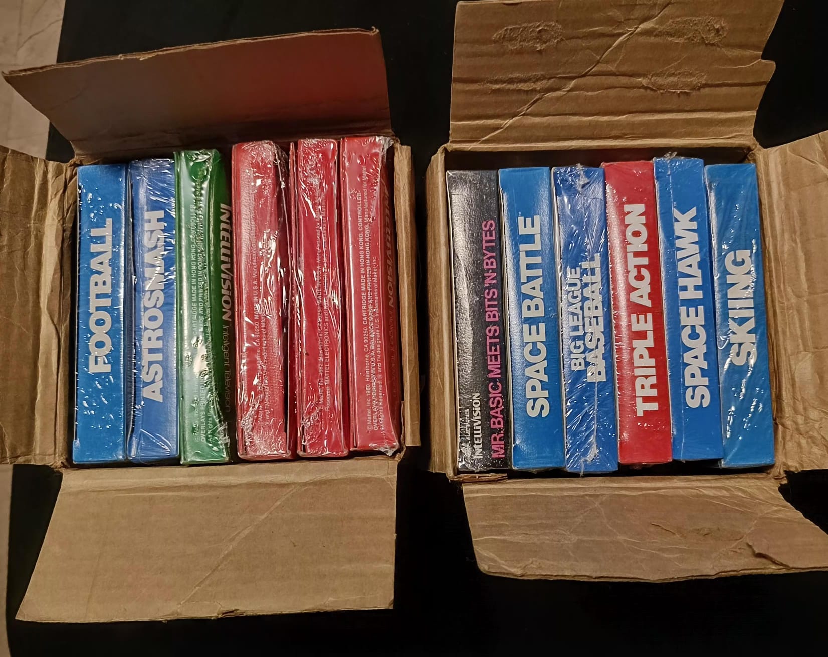 Son 12 juegos de la Intellivision y 12 de la Atari, están incluso en las cajas originales que se entregaban a las tiendas, son 4 cajas con 6 juegos en cada 1, todos precintados y en bastante buen estado de conservación, ya que hablamos que son de 1980.