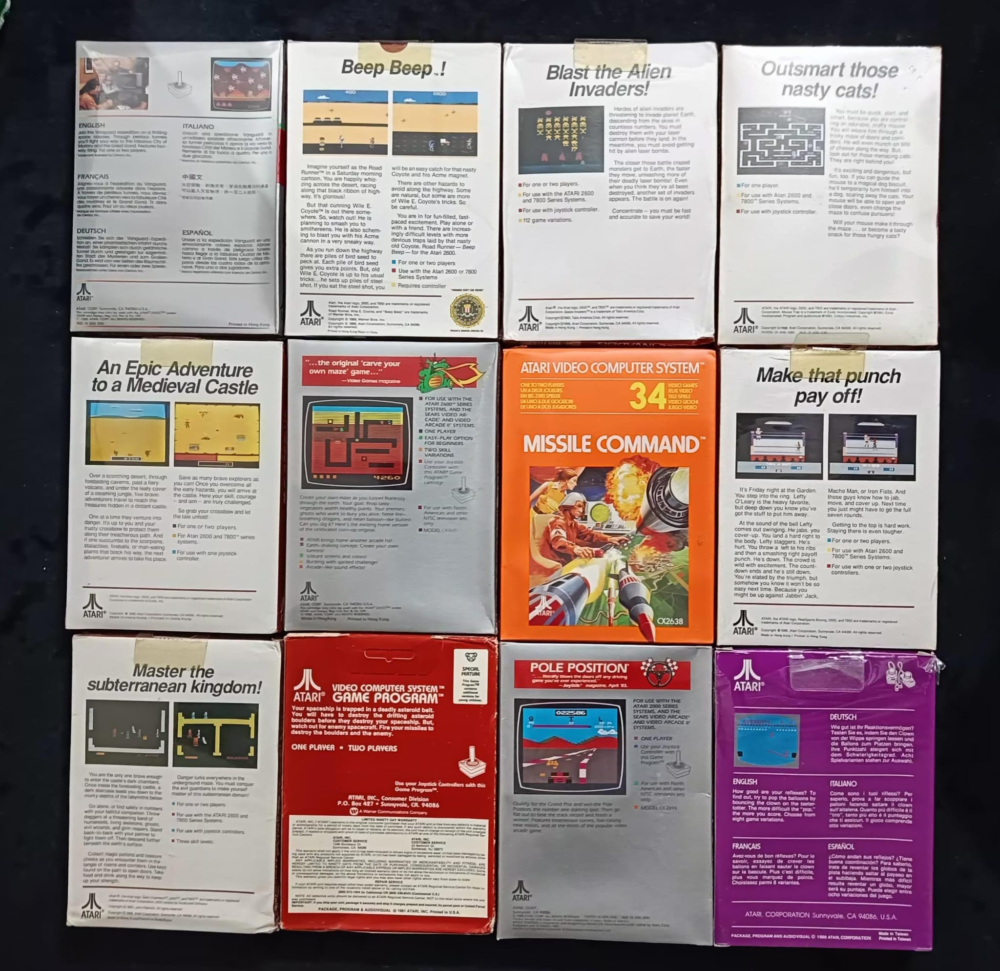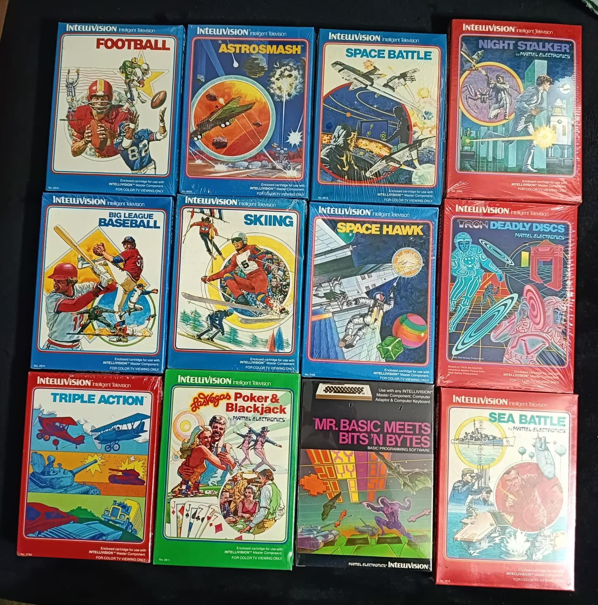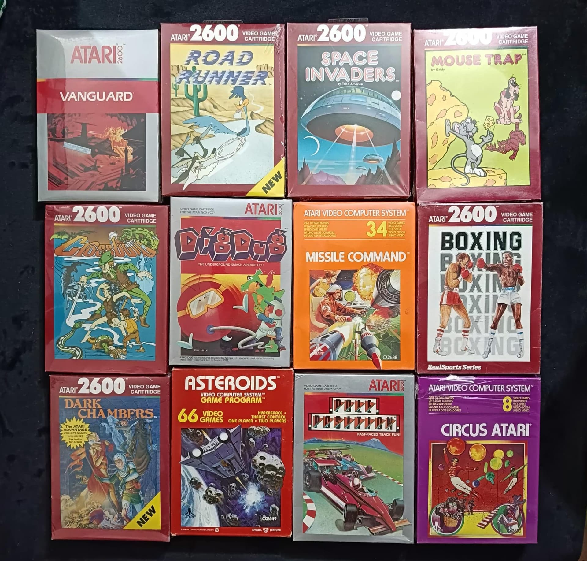 Son 12 juegos de la Intellivision y 12 de la Atari, están incluso en las cajas originales que se entregaban a las tiendas, son 4 cajas con 6 juegos en cada 1, todos precintados y en bastante buen estado de conservación, ya que hablamos que son de 1980.