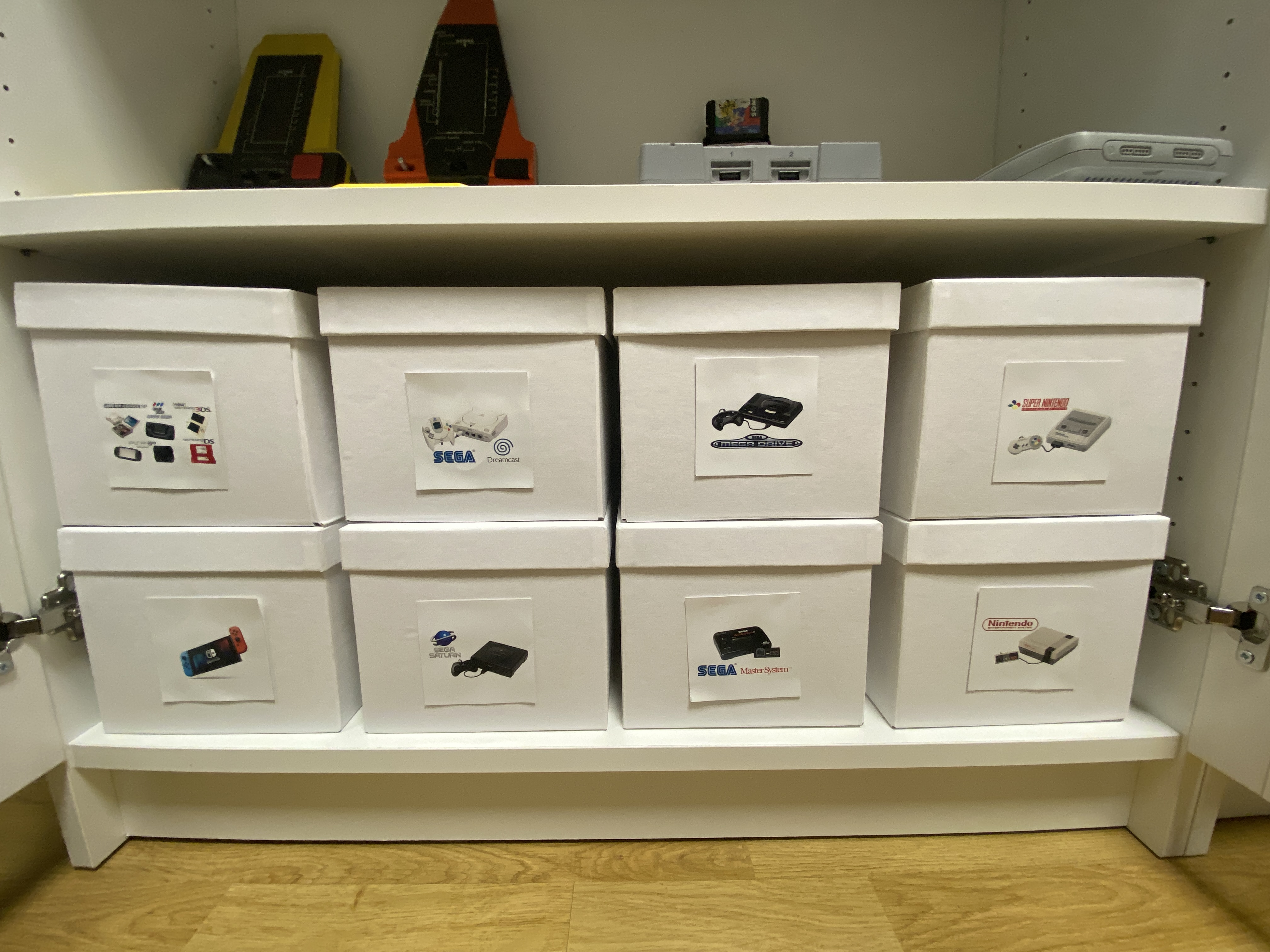 Hueles bien! Seguero 100% jejeje. Las estanterías son las Billy Oxberg con altillo de Ikea y el añadido lateral es la GNEDBY también de Ikea a la que le añadí una prolongación para que tuvieran la misma altura. En las cajas de los bajos hay material de cada consola (controllers, cables…) y están identificadas con una foto de las consolas que hay dentro. Te pongo una foto en la que se aprecia.