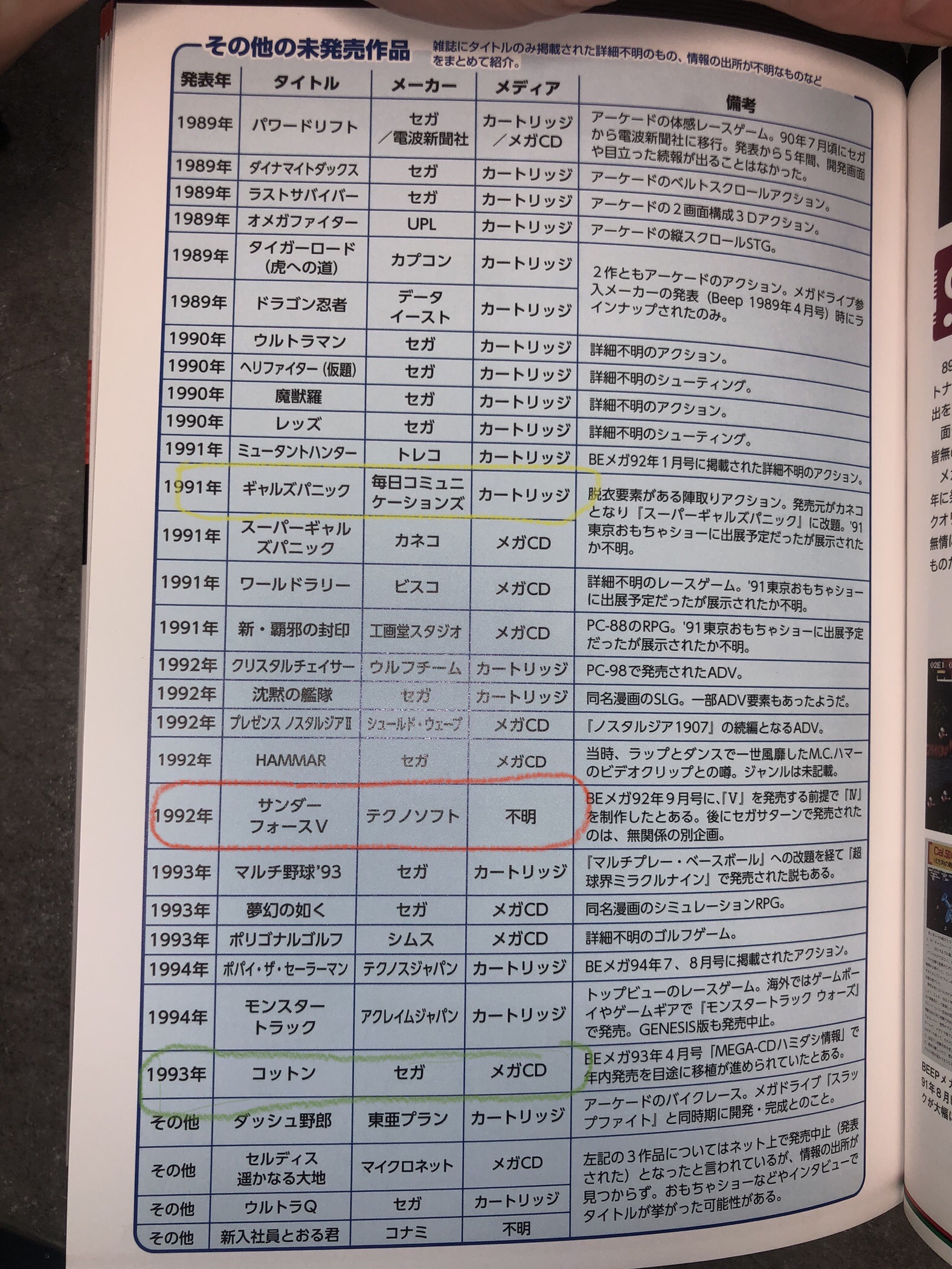 En rojo,Thunderforce 5,que se barajó desarrollarlo para MegaCD,aunque no lo tenían muy claro por las bajísimas ventas del sistema y se canceló.
