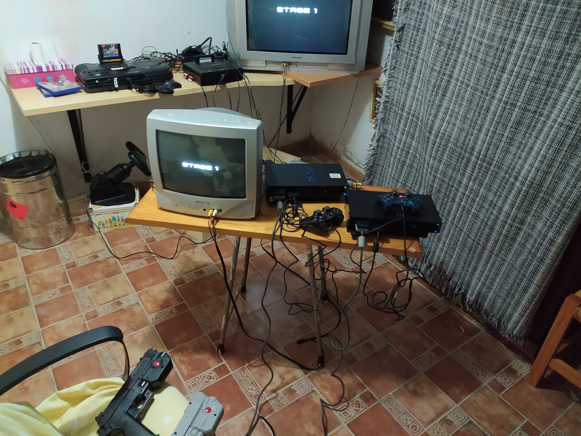 Bueno, disculpad el desorden general que se ve, pero en qué me he visto de hacer funcionar todo esto. Tras varias compras y mucho ensayo y error, he conseguido montar esto: 2 PS2 (+ cable para conectarlas entre sí), 2 teles, 2 Time Crisis II y 2 G-Con45.