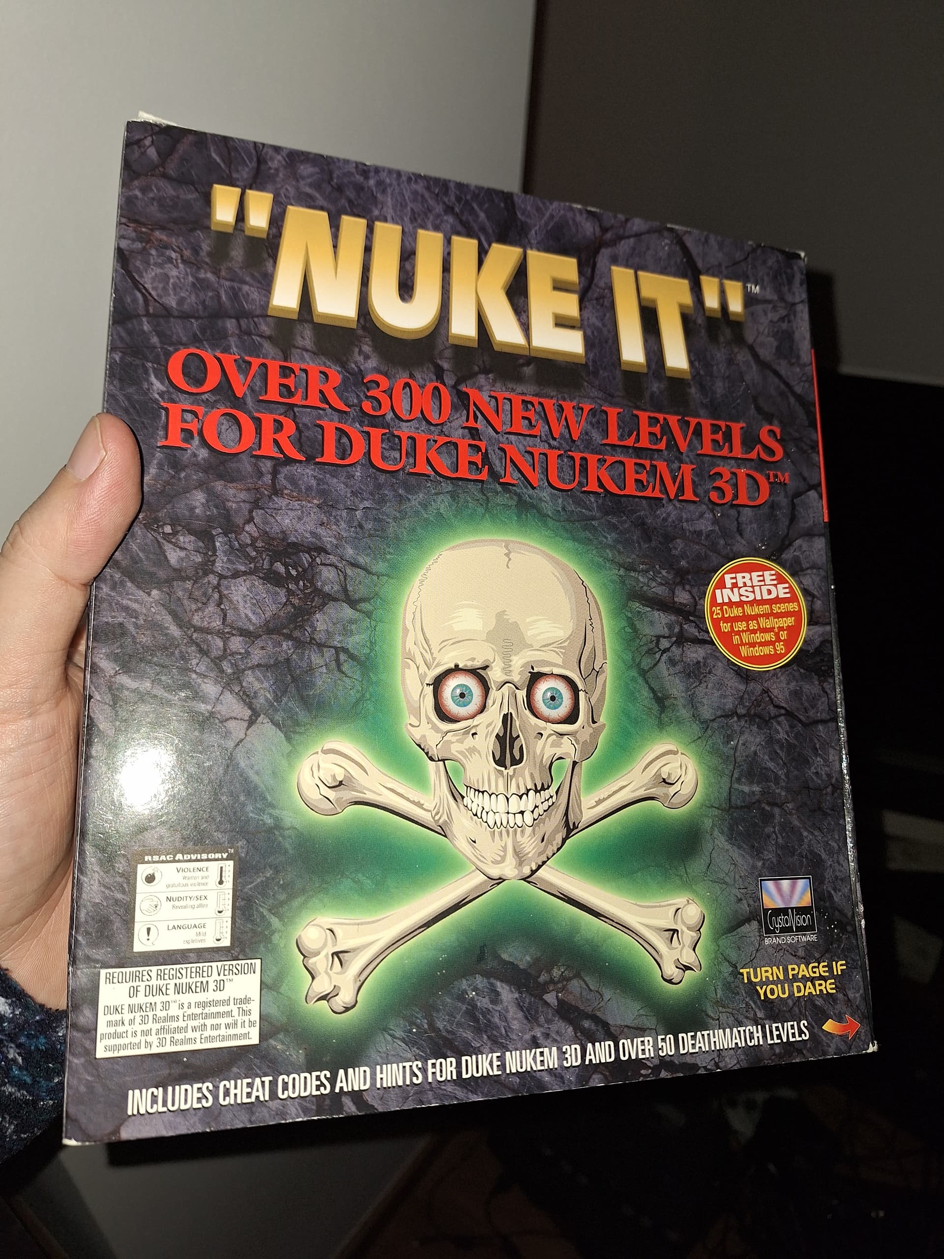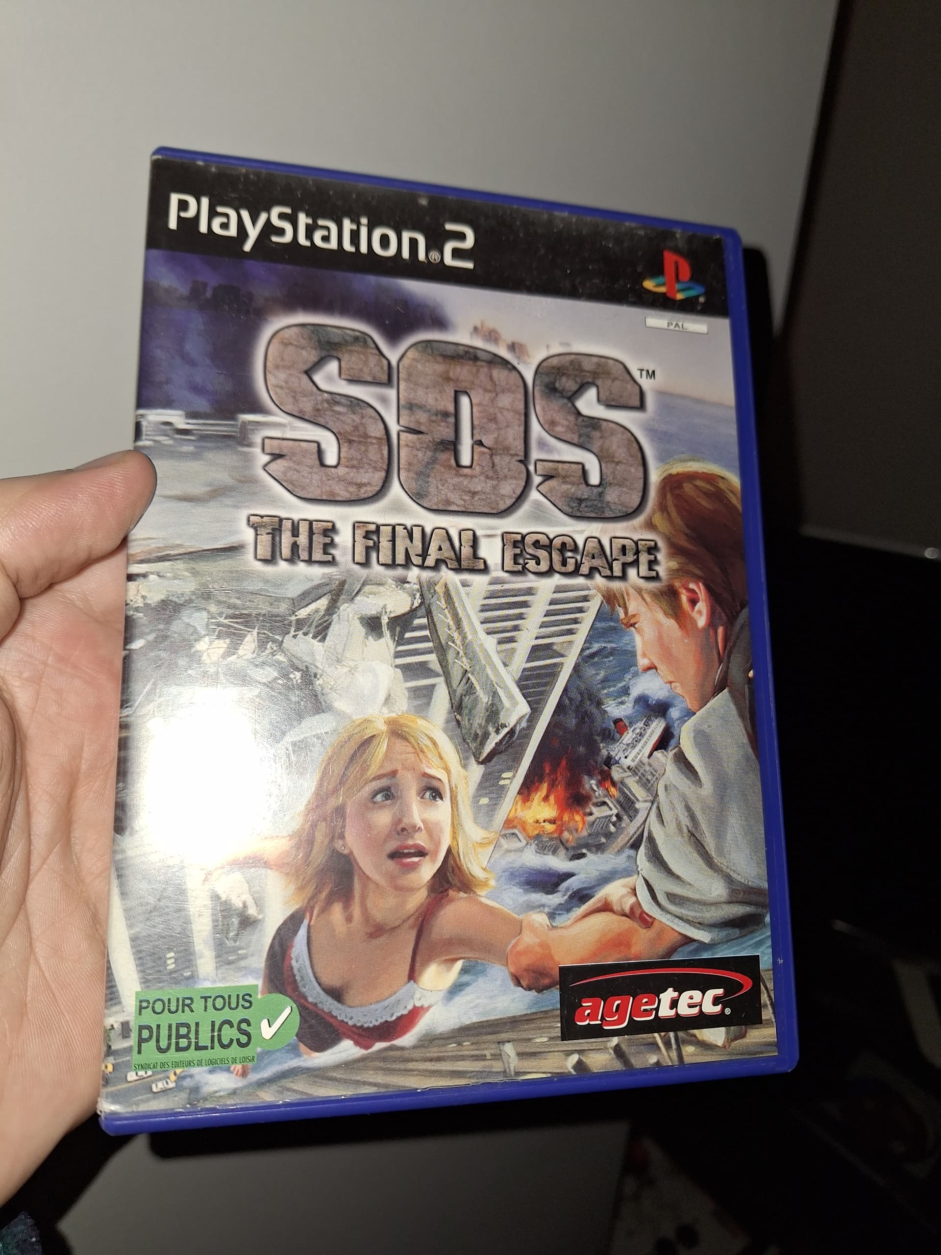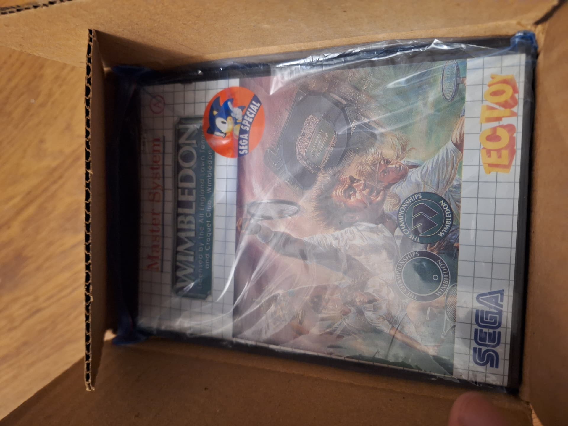 Caja de distribución de Master System de Tec Toy brasileña con 2 juegos Wimbledon precintados, el SOS Final Escape de PS2 PAL ESP (el primer “disaster report”) y el Nuke It! De PC (expansión de 1997 -sin licencia- del Duke Nukem 3D)