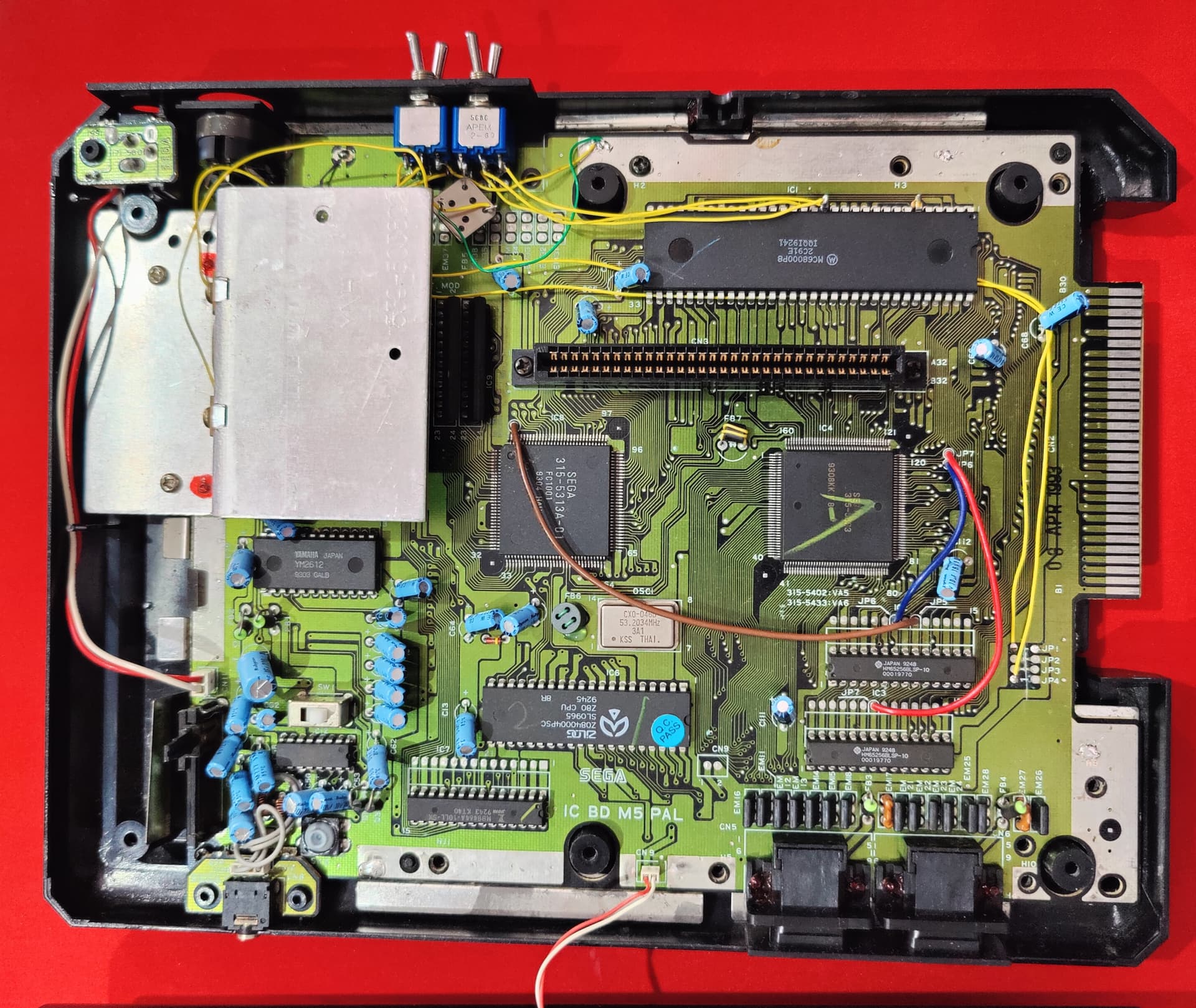 He probado los dos everdrive que tengo y no funcionan las ROMs con el overclock activo, los mismos juegos originales van perfectos. Algunas ROMs no arancan, otras comienzan a dar errores gráficos y se congelan, sin importar la velocidad seleccionada, en mi caso se puede configurar a 10 y 12 MHz, la consola es primer modelo de Mega Drive RGB francesa, aquí la tengo abierta: