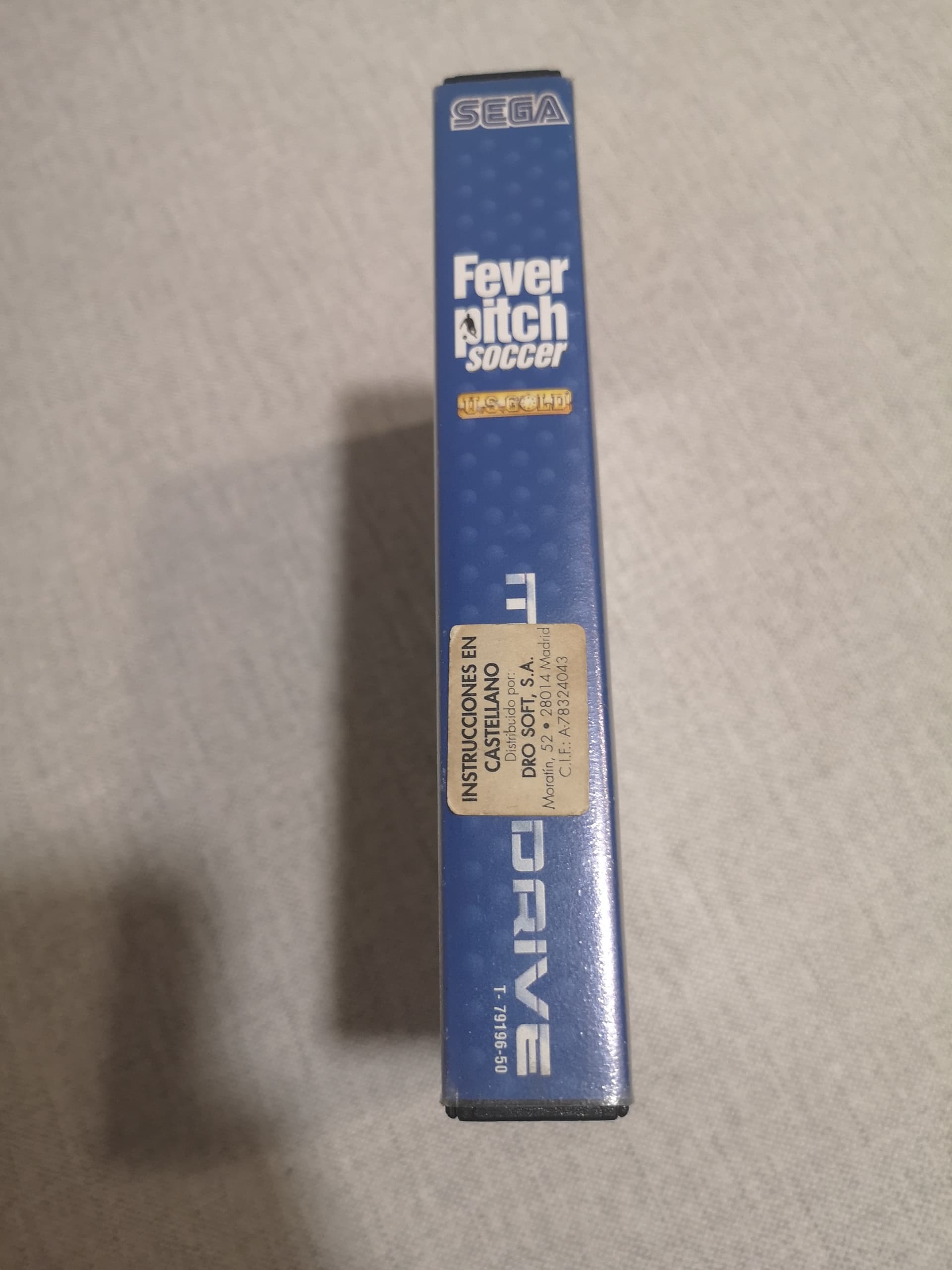 Hola compañeros, estoy haciendo inventariode mi colección de megadrive y en una de las cajas, más concretamente en la de un Fever Pitch Soccer, viene pegada en el lomo está pegatina en la que indica que se distribuye por Dro Soft, SA.