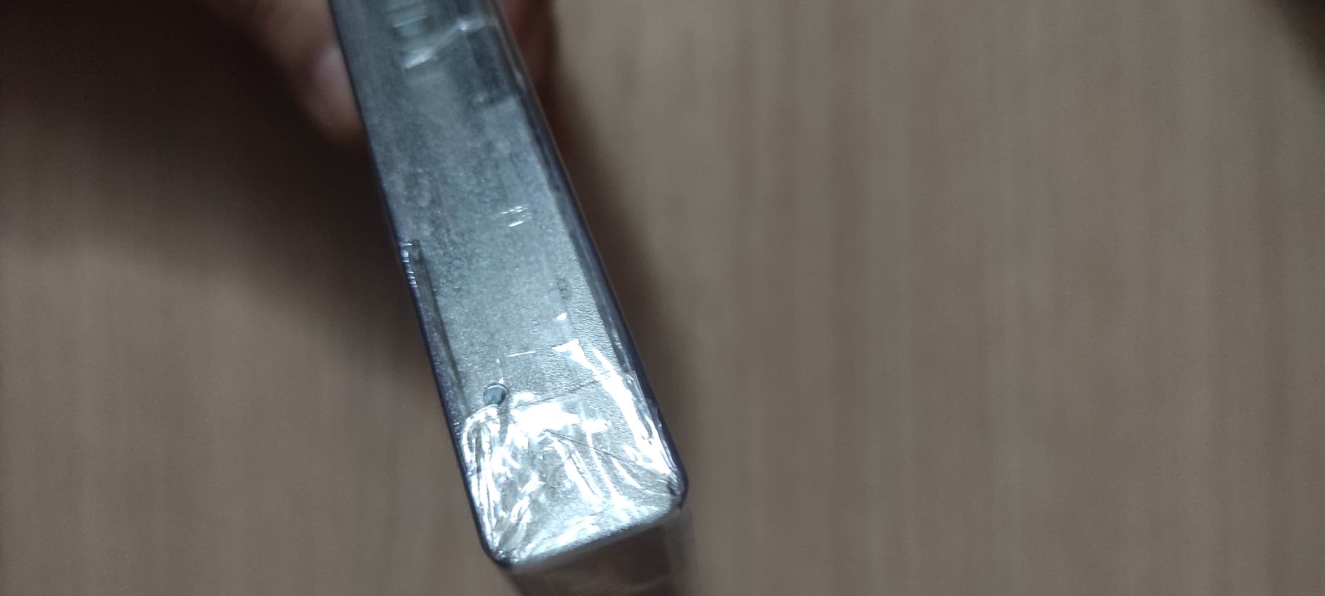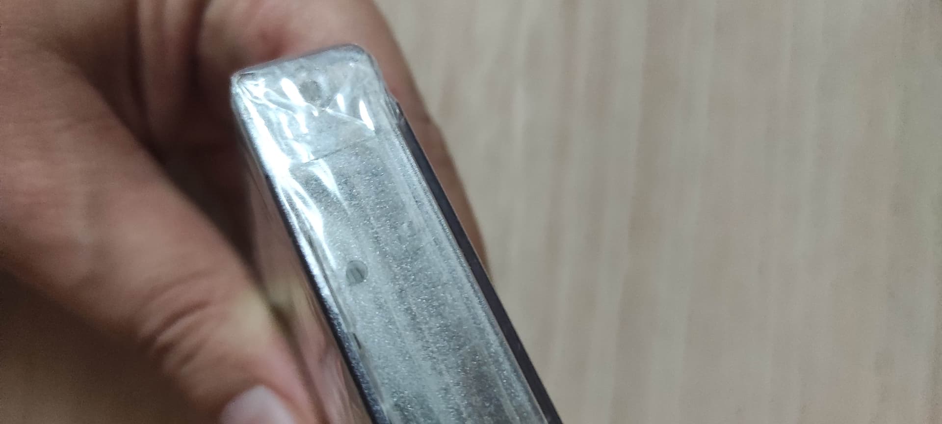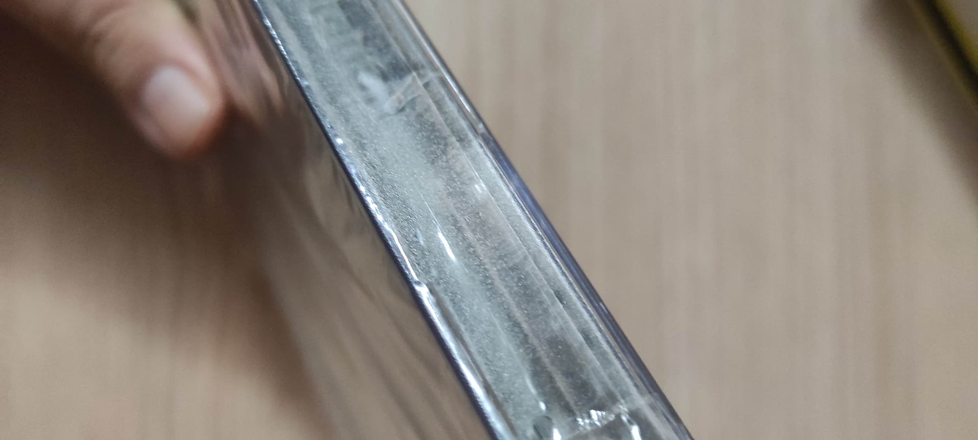 A lo que dicen del pegamento es un doblez del plastico y tiene como una burbuja de aire.