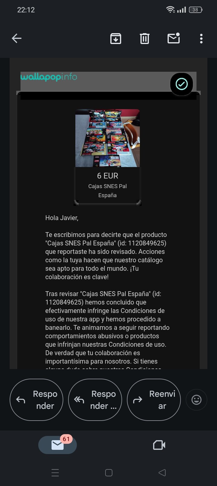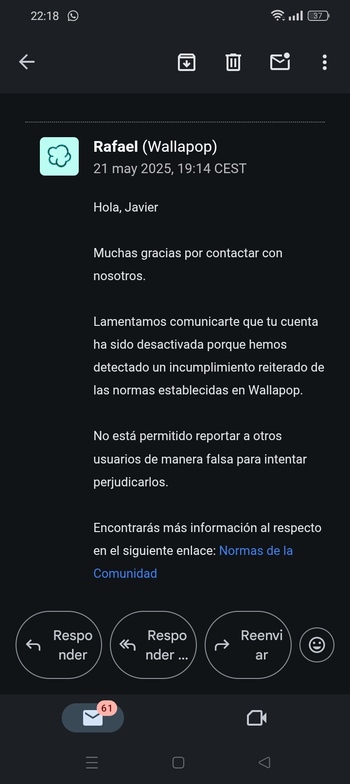 Yo ya paso de denunciar a gente en Wallapop ni Vinted porque precisamente acaba pasando eso y aunque casi nunca tengo dinero en la app sópo basta que me desactiven la cuenta con algo en el monedero…Siento tu situación…